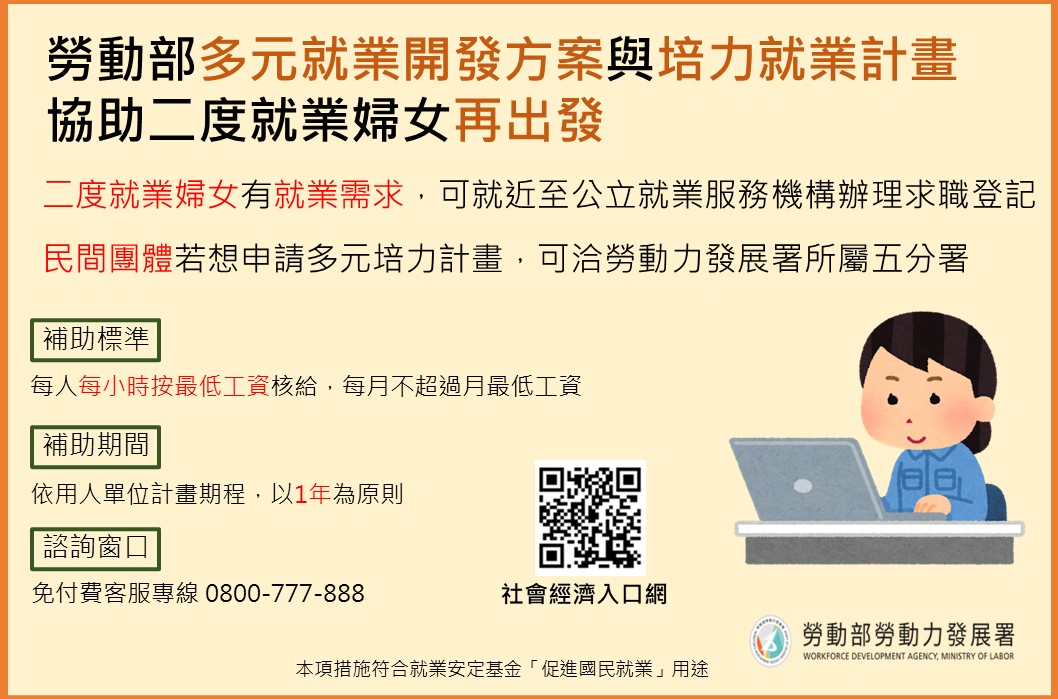二度就業婦女是職場的生力軍,為協助因家庭因素離開職場的婦女及早規劃重返就業,促進女性勞動參與,勞動部推動「多元就業開發方案」與「培力就業計畫...