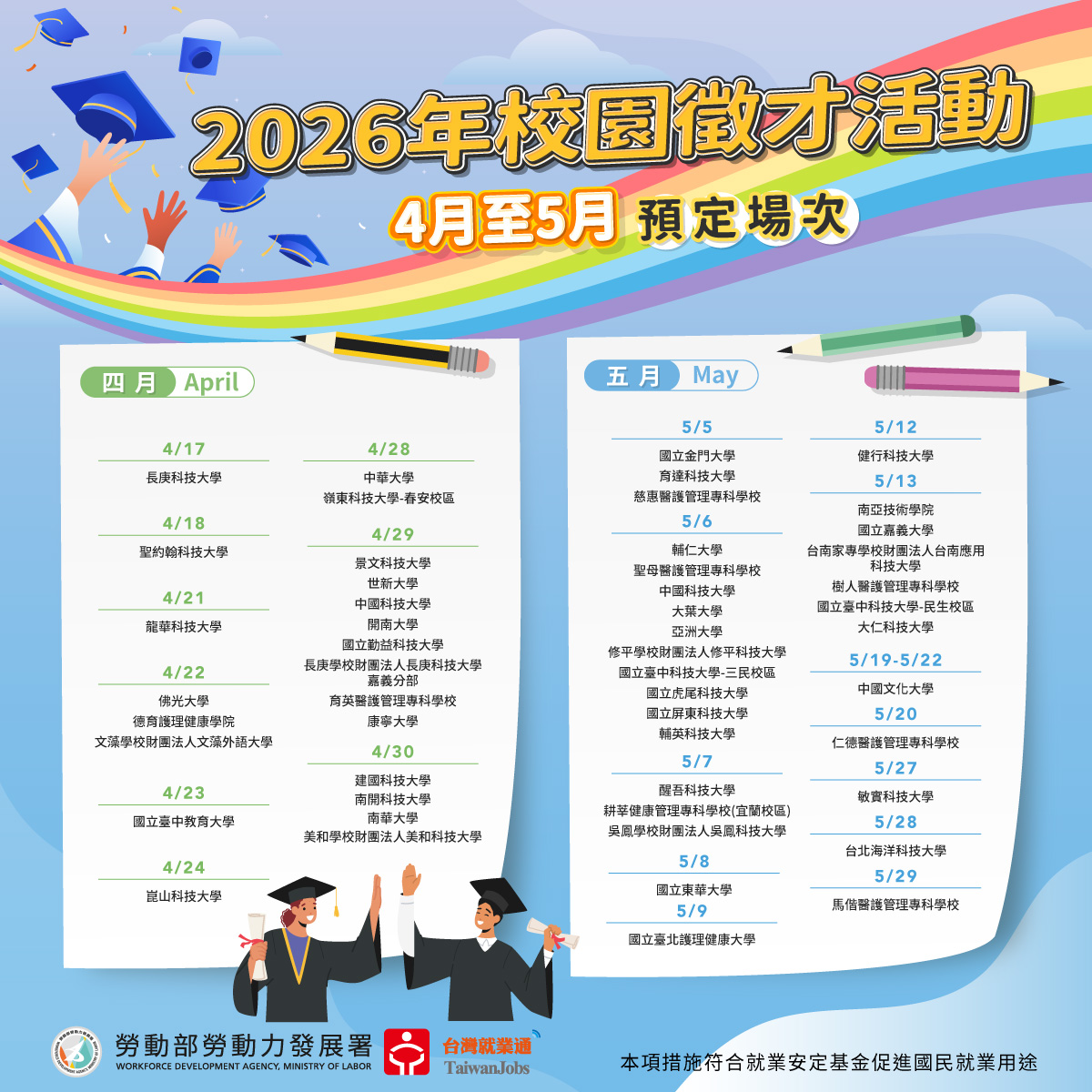 除了5場年度大型就業博覽會,勞動力發展署也在各地與大專校院合作舉辦校園徵才活動,讓青年就近就能與廠商面對面了解職缺,加快尋職錄取速度。自從3月起,勞動力發展署在全臺將舉辦95場校園徵才活動,提供超過17萬6千個以上的職缺,已吸引大批青年參與,成功媒合人數持續增加,光是4月至5月間就會舉辦52場次,至少6萬5千個職缺,即將踏出校園的青年朋友,都可把握這離你找工作最近的機會!