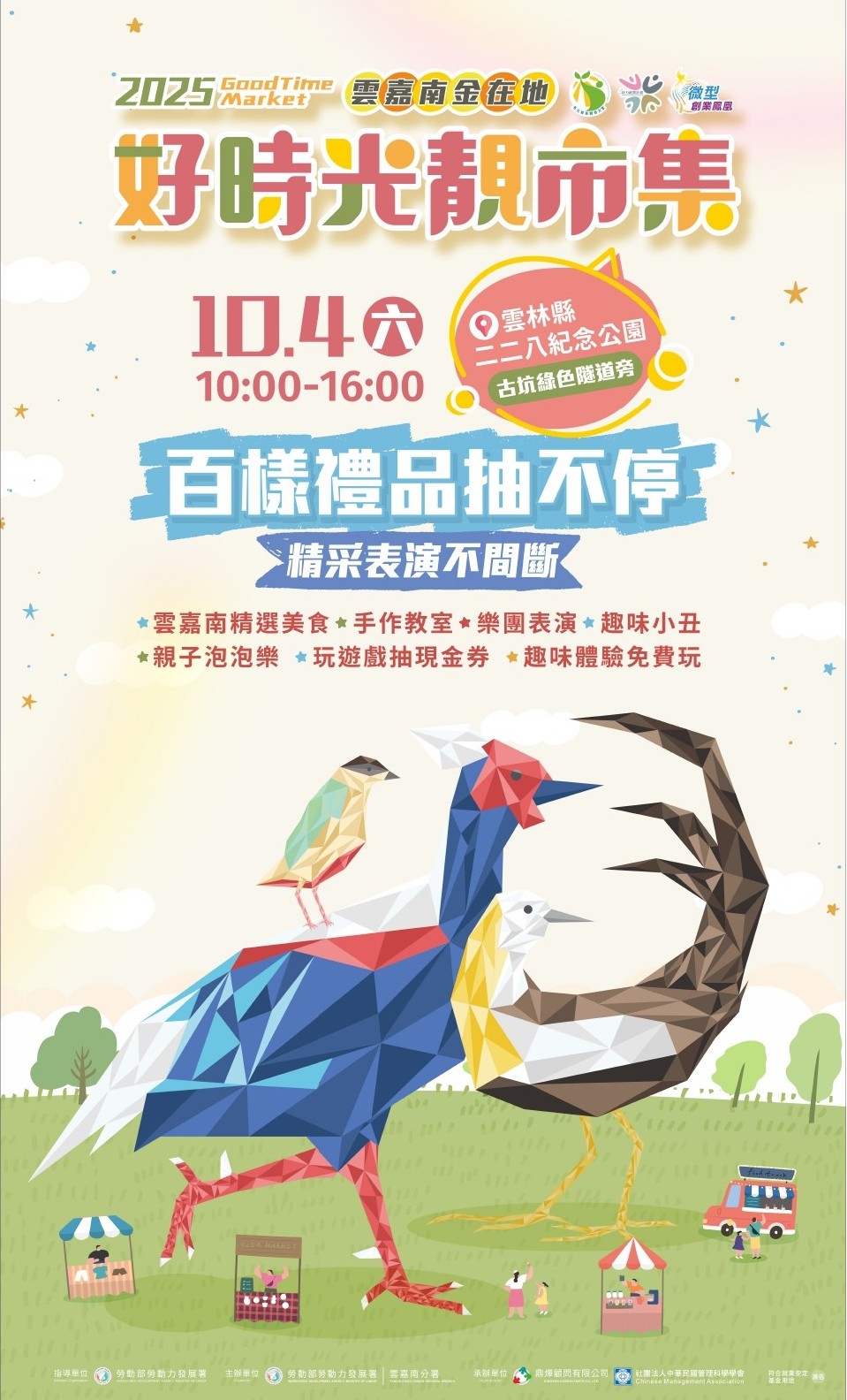 喜迎中秋佳節與連假出遊人潮,勞動部勞動力發展署雲嘉南分署即將於10月4日舉行「好時光靚市集:雲嘉南金在地」活動,共邀請34家雲嘉南分署輔導單位,包含多元培力單位及微型創業鳳凰商家,齊聚雲林古坑二二八紀念公園,展現屬於雲嘉南的在地風采。活動當天不僅有特色美食與精采表演,民眾消費集點即可參加抽獎活動,最高可抽中價值上萬元的獎品,歡迎民眾前來逛買、同樂中秋。