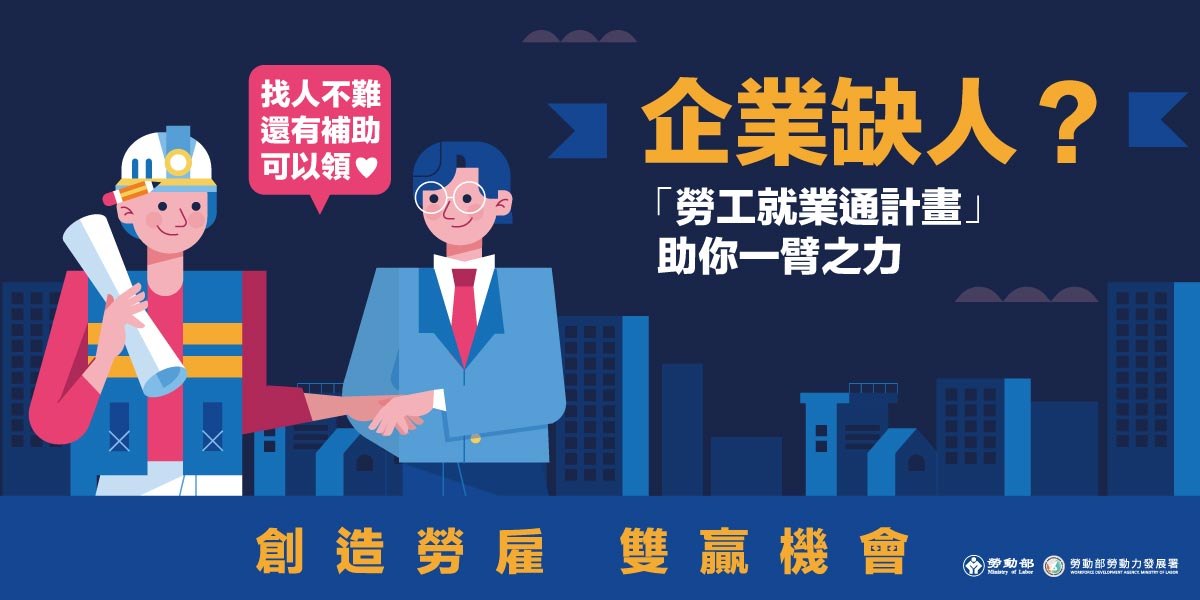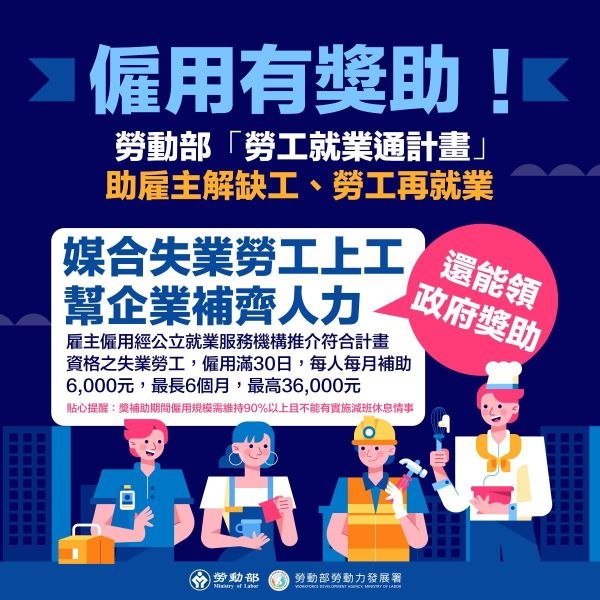 為協助企業補足人力缺口,同時支持受國際情勢影響產業的失業勞工,勞動部勞動力發展署持續推動「勞工就業通計畫」,透過公立就業服務機構媒合人力,並提供雇主僱用獎助,鼓勵雇主釋出工作機會,協助失業勞工儘速重返職場、穩定就業。