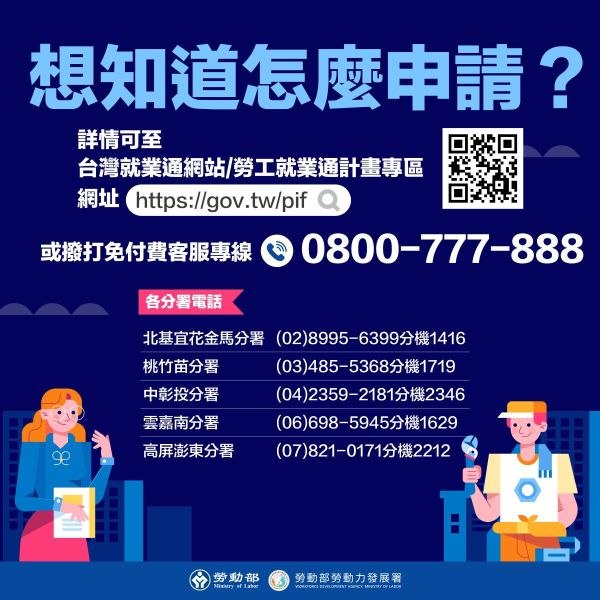 https://gov.tw/pif)查詢,或撥打免付費客服專線0800-777-888,也歡迎洽詢勞動力發展署所屬各分署。