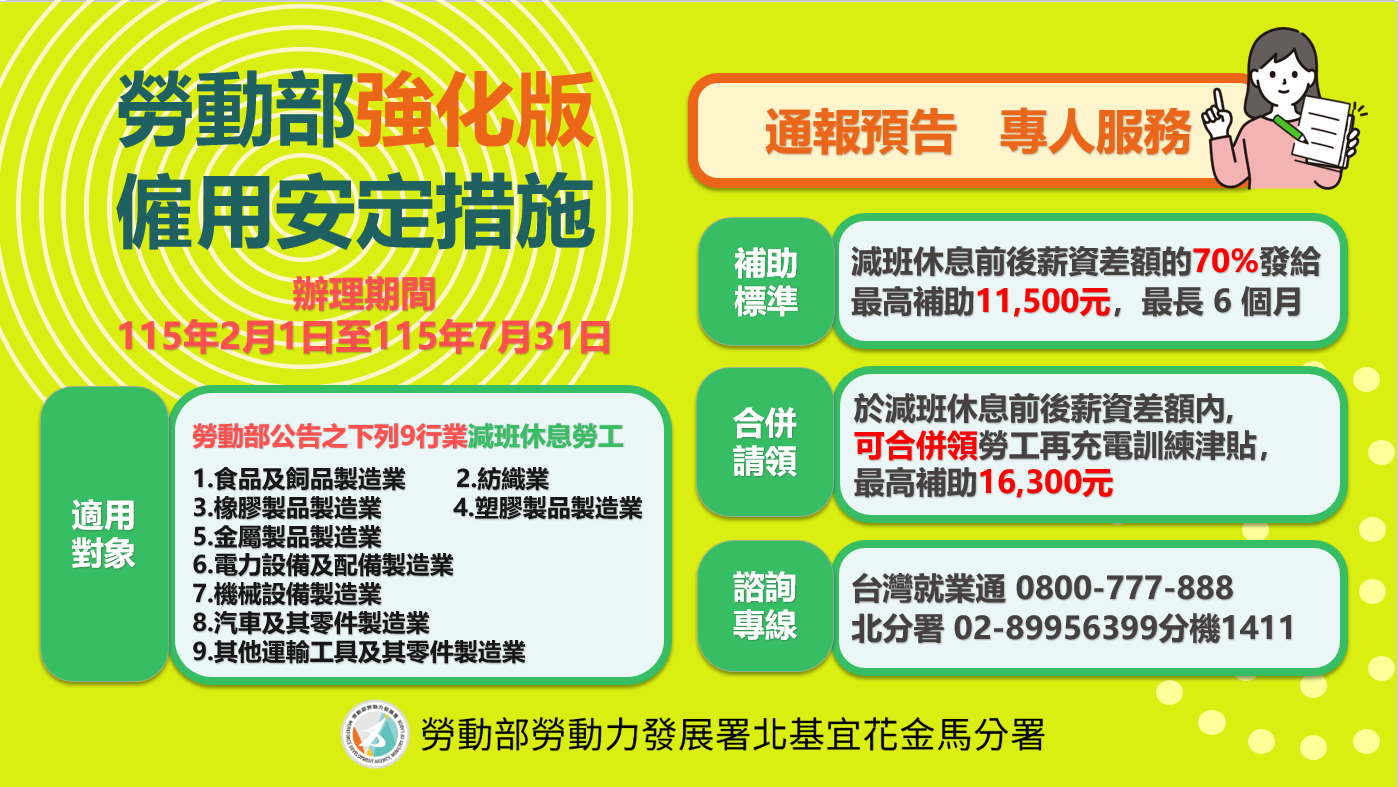 北分署說明,強化版「僱用安定措施」係針對因國際經貿情勢變動,經勞雇雙方協議實施減班休息之企業勞工所設計,目的在於減輕減班休息期間薪資落差對勞工生活造成的影響,並協助企業穩定留才。本措施適用於「食品及飼品製造業」、「紡織業」、「橡膠製品製造業」、「塑膠製品製造業」、「金屬製品製造業」、「電力設備及配備製造業」、「機械設備製造業」、「汽車及其零件製造業」,以及「其他運輸工具及其零件製造業」等9大行業別之受僱勞工。於延長公告期間內,若雇主與勞工協商實施減班休息達30日以上,並向地方勞工主管機關完成列冊通報,勞工即可於實施滿30日之次日起90日內,向分署申請減班休息期間之薪資差額補貼。