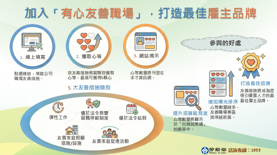 勞動部於「台灣就業通」網站,推出「有心召你來~5心友善職場」企業資訊揭示活動,自115年2月11日至2月28日開放試填,歡迎企業踴躍參與,將照顧員工的友善措施,轉化為招募優質人才的最佳招牌,建立正向的雇主品牌形象 。