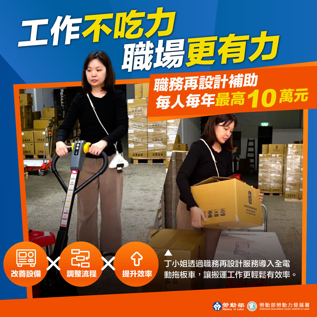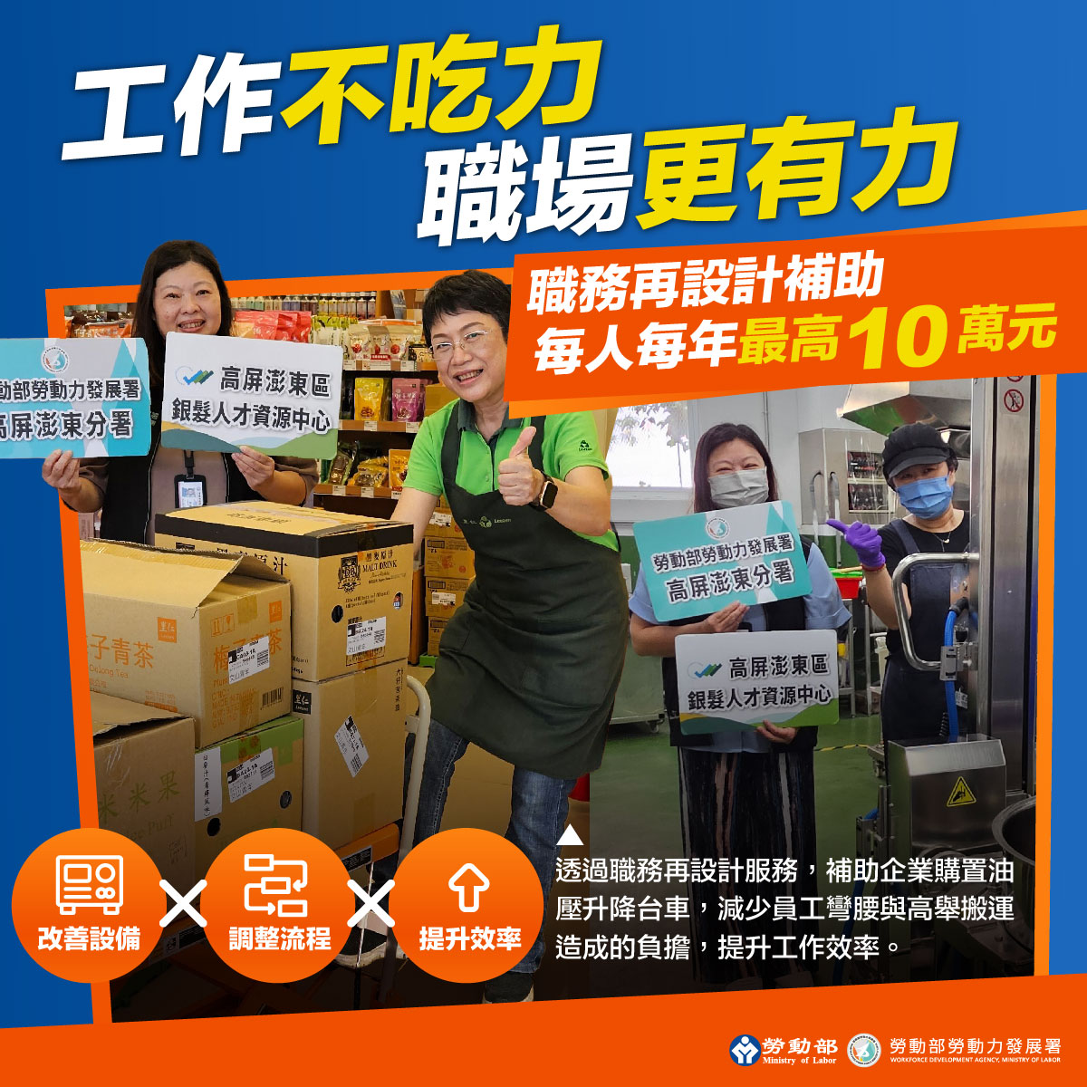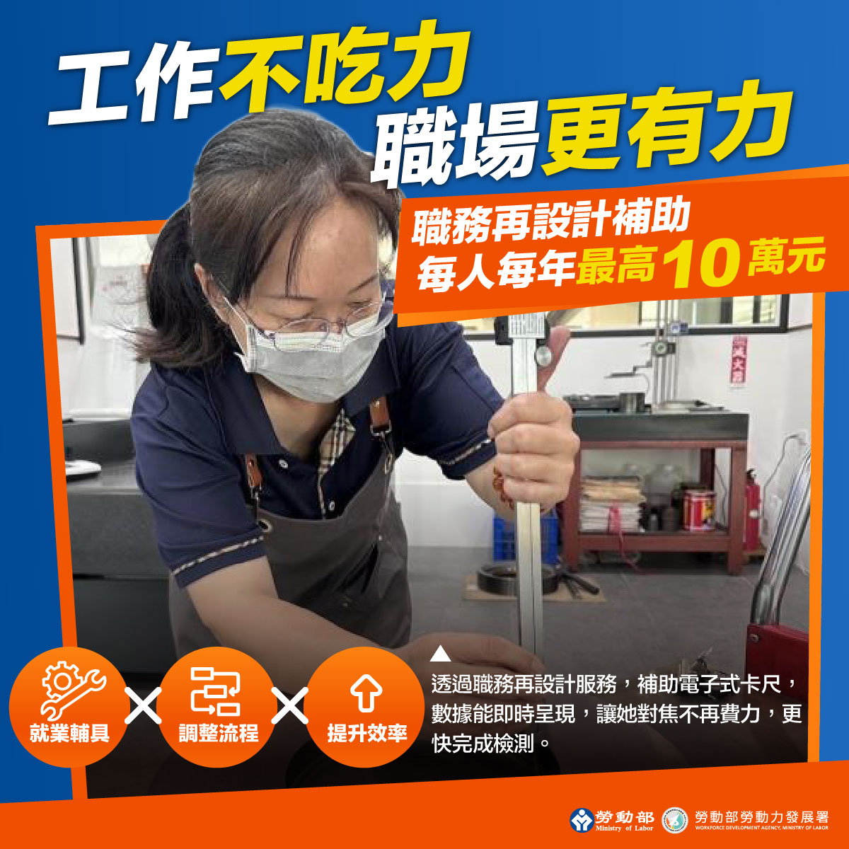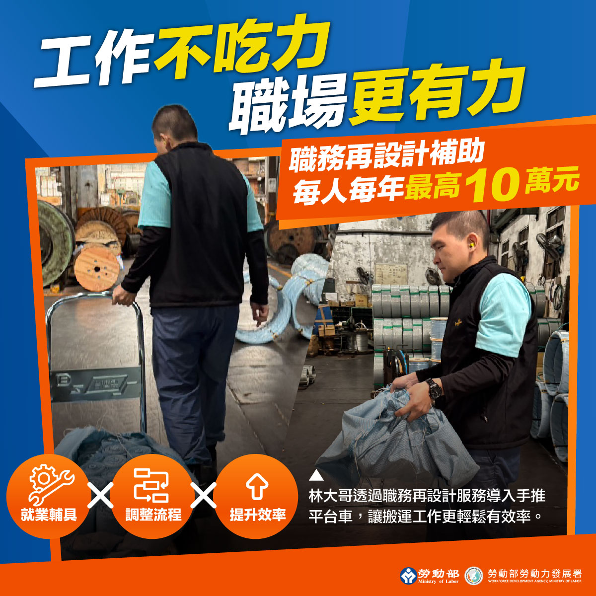 職務再設計服務透過專家實地評估,針對工作設備、就業輔具及工作方法進行改善,不僅能有效排除勞工工作障礙,更能實質解決產業用人的痛點。勞動力發展署所屬各分署深入工作現場,提供具體解決方案,例如北基宜花金馬分署協助印刷廠導入「全電動拖板車」與「升降台車」,解決跨廠房搬運重物的負擔;桃竹苗分署為科技業精密維修人員提供「附燈5倍放大鏡」與「專業頭燈」,克服微小零件辨識與照明不足的限制;中彰投分署協助製造廠運用「手推平台車」,有效優化包裝動線並降低手部負擔;雲嘉南分署與高屏澎東分署則分別透過導入「電子式卡尺」與「油壓升降台車」,協助中高齡品保及門市人員克服視力退化影響與彎腰搬運的體力限制。從改善重物搬運、精細作業到輔助視力,各分署量身打造的解決方案,成功讓勞工留任、企業產能不中斷。