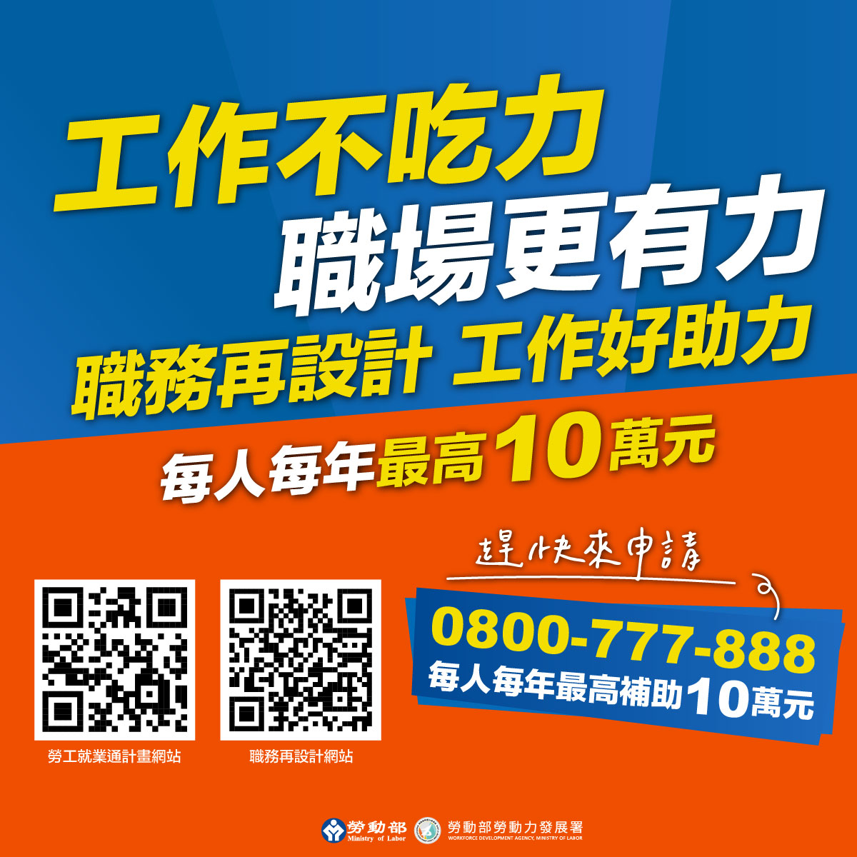 因應國際情勢影響,勞動部自114年9月30日起推動「勞工就業通計畫」,整合僱用獎助、崗位訓練及職務再設計三大資源,協助失業勞工重返職場。其中,「職務再設計」透過改善工作環境與工作方法,有效減輕勞工負擔並提升產能,是企業穩定留才的關鍵利器。每人每年補助最高可達新臺幣10萬元,呼籲企業把握機會踴躍申請。